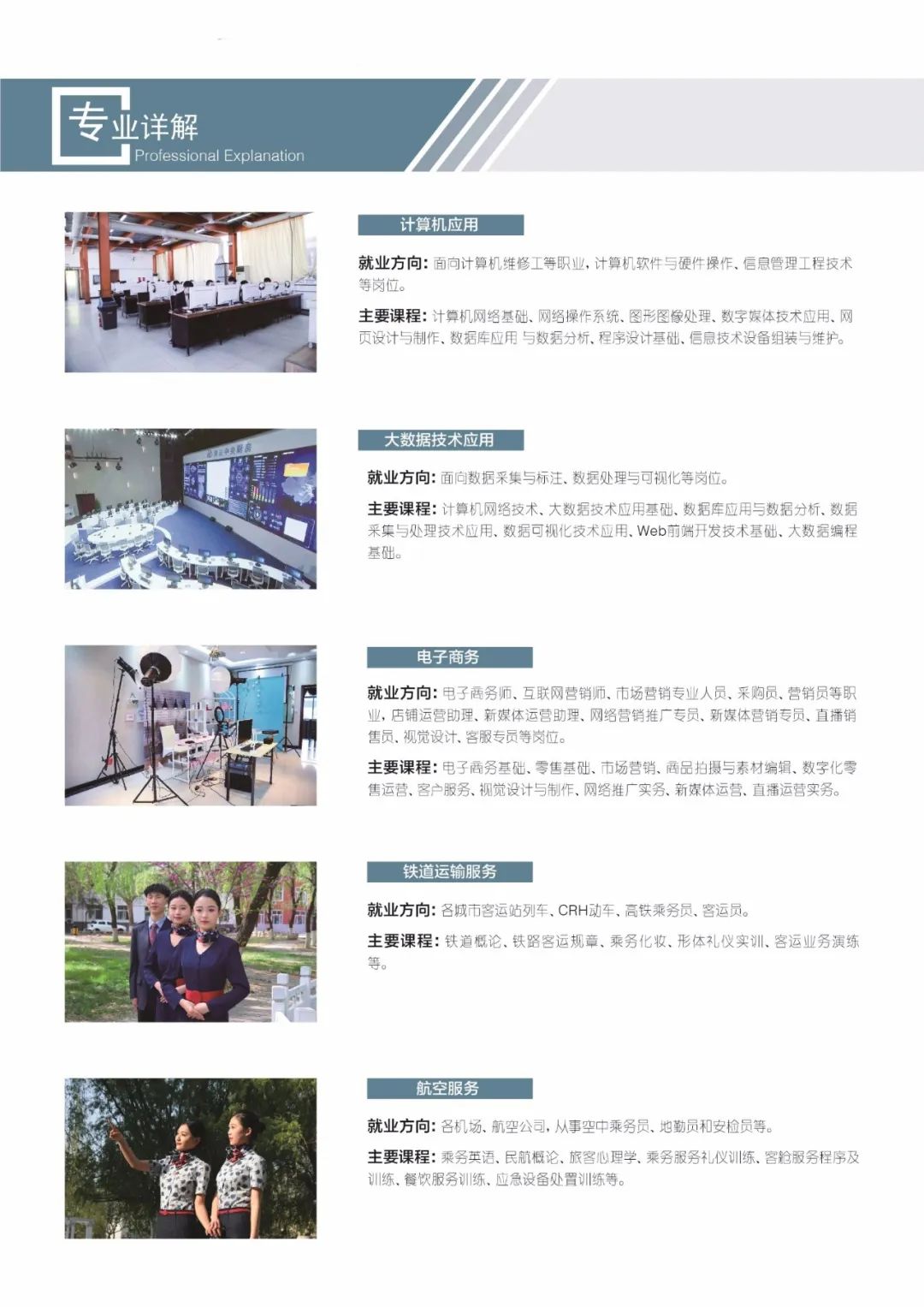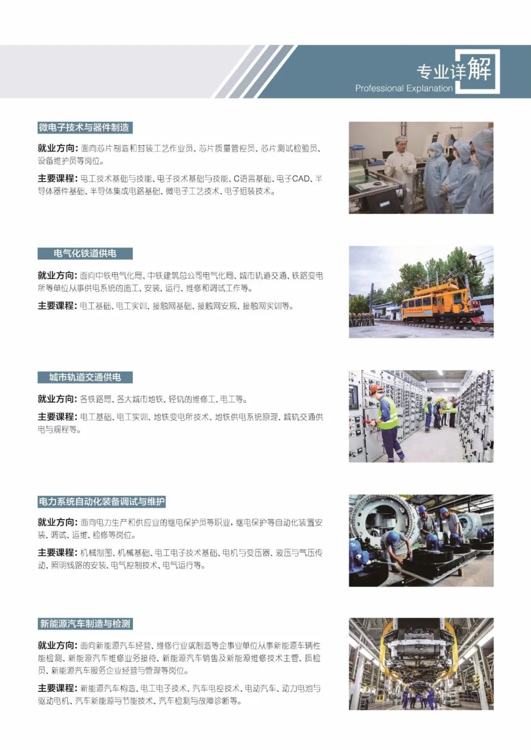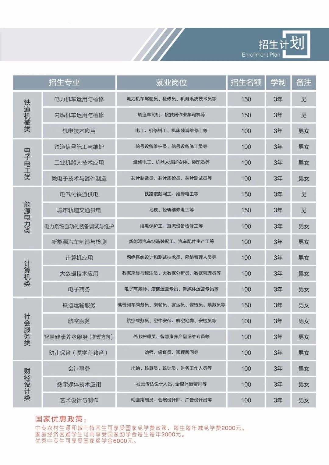 学制: 3年,3+2中职与高职,3+3大专 专业: 机电技术,铁道供电系,铁路运输系,计算机应用,学前教育等; 大专课程:铁路运输管理,机电一体化,电子商务,数字媒体,电气化铁路供电,铁道车辆运用与检修